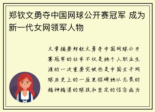 文章摘要:郑钦文勇夺中国网球公开赛冠军的壮举,不仅是她个人职业生涯的一次重要突破,也是中国女子网球历史上的一座里程碑。她以无畏的精神、精湛的球技和坚定的信念,成为了新一代女网领军人物。本文将从郑钦文的...